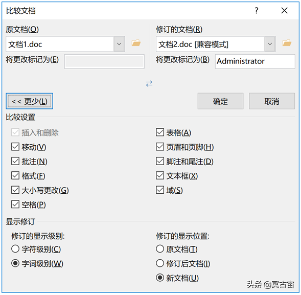 2、在弹出窗口中,分别选择原文档和修改后后的文档,这里需要注意的是,不能把原始文档和修改文档位置填反。可以看到,在下面的更多功能选择中,可以对要进行比较核对的内容进行设置。点击确定。