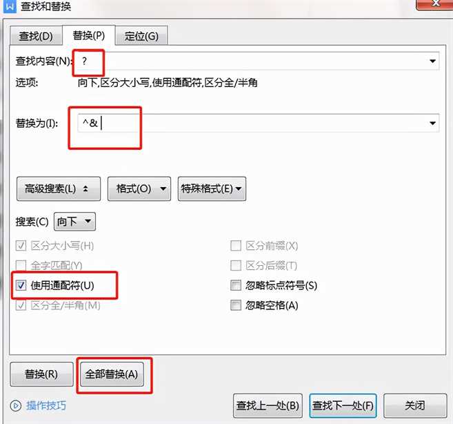同样打开查找和替换对话框,在查找中输入通配符【?】,在替换中输入【^& 】(^&表示原先内容,注意^&后面加空格),勾选使用通配符,点击【全部替换】即可。