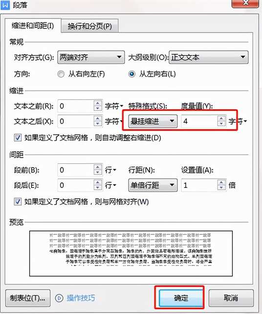 ②选中文本,鼠标右键点击【段落】,在此段落界面中,选择【缩进和间距】——特殊设置为【悬挂缩进】,度量值设置为【4字符】,然后点击【确定】即可。