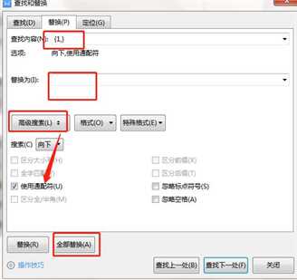 选中文本区域,快捷键【Ctrl+H】打开【查找和替换】对话框,然后在查找中输入【 {1,}】,({1,}表示出现一次以及以上,另外,注意{1,}前面要加空格),在替换中不输入任何内容,点击【高级搜索】,勾选使用通配符,最后点击【全部替换】即可;
