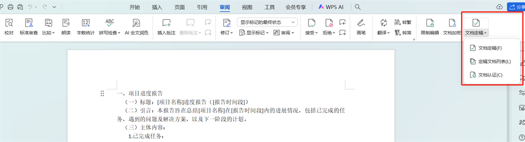 打开需要处理的文档,点击菜单栏中的「审阅」选项,在弹出的功能区里找到「文档定稿」按钮并点击,随后点击「确定」。完成这些操作后,文档的右侧会出现一个「定稿窗格」,在这个窗格里会清晰地显示当前文档处于已定稿状态。