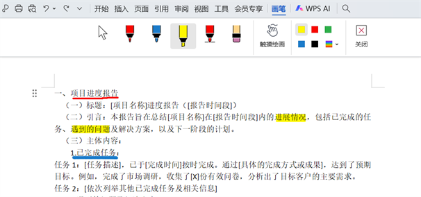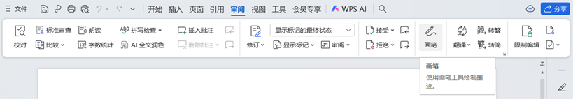 点击顶部「审阅」菜单,找到「画笔」按钮,指针变为画笔样式即可开始绘制,可标注段落或画示意图。
