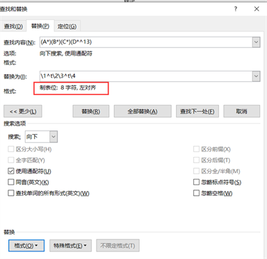 如果想换一个格式,可以在替换中输入1^t2^133^t4,再次点击全部替换。