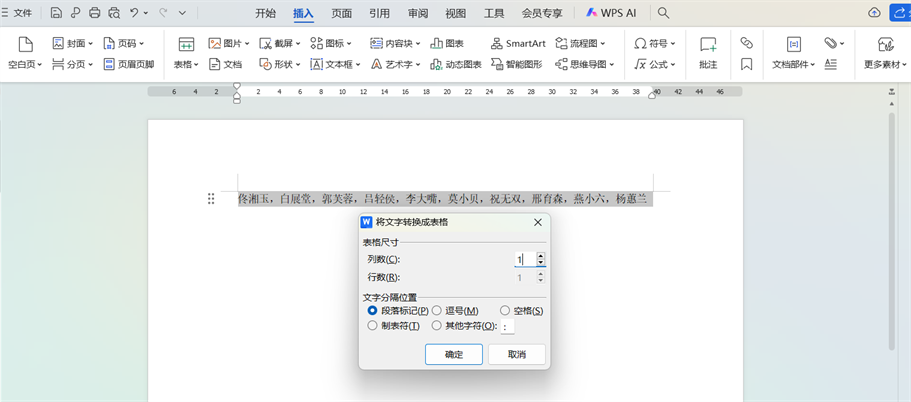 - 依次点击「插入」-「表格」-「文字转换成表格」:在弹出的「文字转表格」窗口中设置“文字分隔位置”,并根据需要设置行和列。
