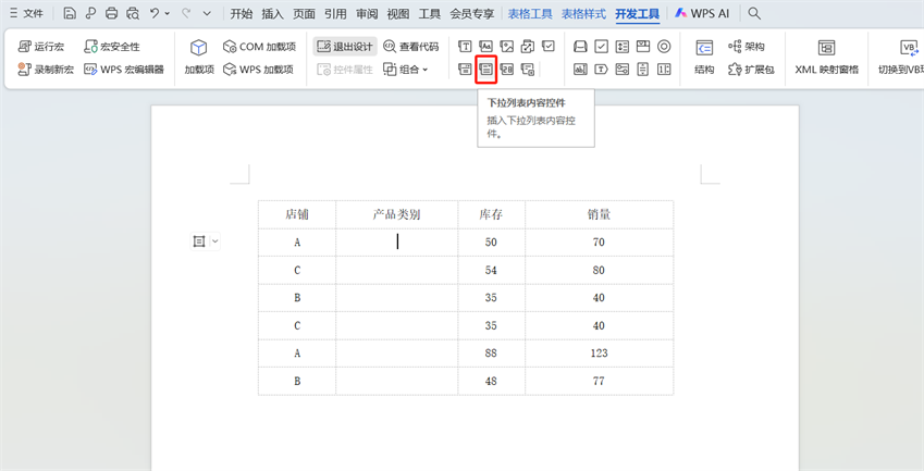 第1步:把光标放到【产品类别】列的首个空白单元格,切换至【开发工具】选项卡,在【控件】功能区点击【下拉列表内容控件】,该单元格就会插入一个下拉列表内容控件。