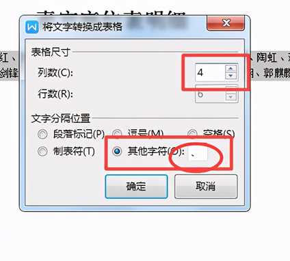 2、在“列数”中输入需要选择的列数,点击“其他字符”输入名单间隔符号顿号,确定;