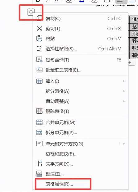 3、光标放到表格左上角图标,然后点击鼠标右键,选择【表格属性】