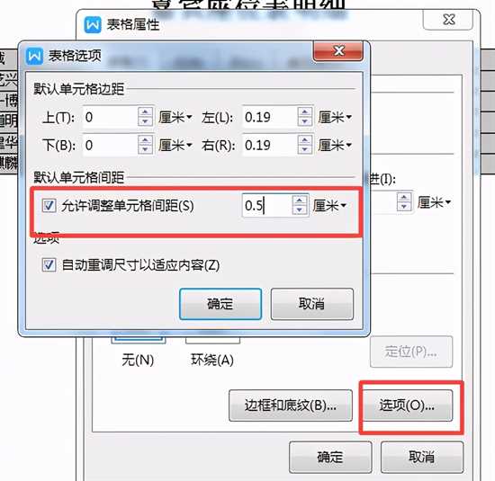4、点击【选项】,勾选【允许调整单元格间距】,设置为【0.5厘米】。