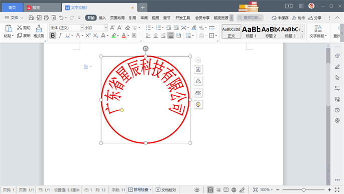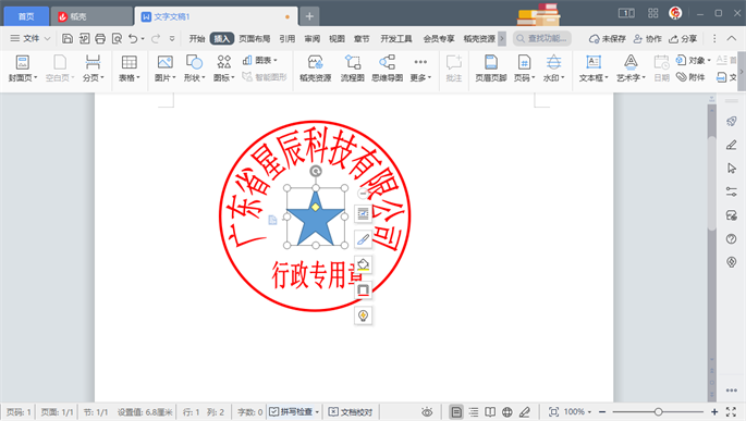 最后,调整各个形状的位置后,选中所有形状,在【快捷对齐工具】菜单中单击【组合】,这时,公司的电子印章就做好了。