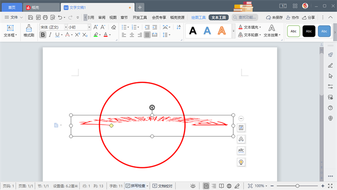 单击【艺术字】输入框,输入印章名称,选中印章名称,单击【文本工具】菜单,单击【文本填充】选择【红色】。