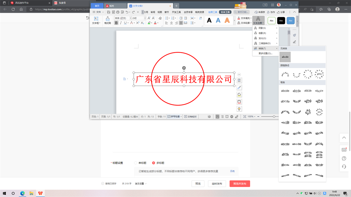 利用鼠标左键拖动【艺术字】中的黄色菱形锚点,调整公司名称弯曲的角度。