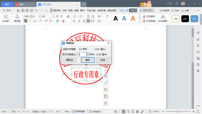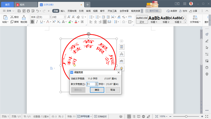 利用鼠标拖动艺术字右下角的圆形锚点,将长方形艺术字框调整成正方形,单击【开始】菜单下的【中文版式】,点击【调整宽度】,单击【确定】。
