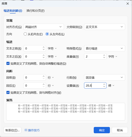 5.段落设置:全选文字后右键“段落”,“缩进和间距”中设首行缩进2字符,段前后0行,行距固定值28.8磅(国标规定)。“换行和分页”勾选“按中文习惯控制首尾字符”,其余选项可按需调整。