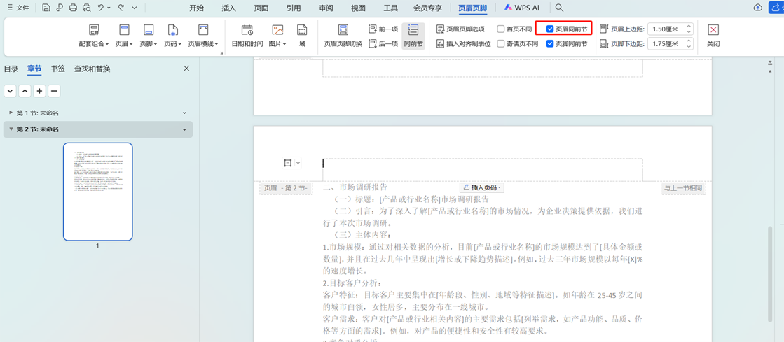- 取消同前节设置:双击第2节页面的顶端,打开「页眉与页脚」选项卡,此时「同前节」按钮处于选中状态,点击取消其选中状态。