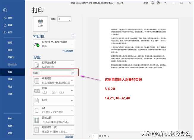 在文档中需要打印不连续的页面时,例如,想要打印第3页,第6页,第20页,可以依次点击【文件】→【打印】→【页数】,在页数文本框内输入3,6,20。如果在打印页面内有连续页数,例如要打印第14页,第21页,第30页,第31页,第32页,40页,那么可以这样输入14,21,30-32,40。