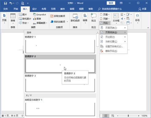 打开文档,执行“插入>页码”命令,选择其下拉列表中需要的样式插入即可。