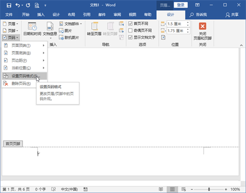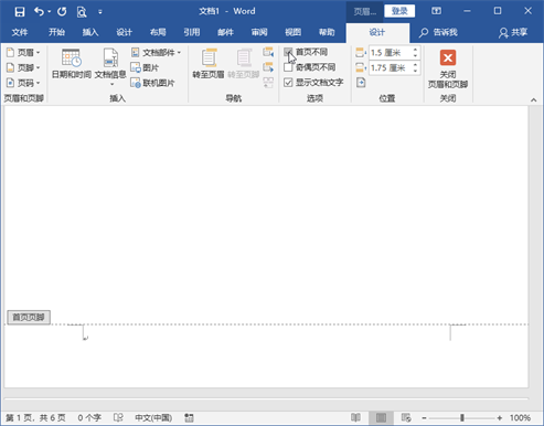 此时文档中所有页面都插入了页码,并打开了“页眉和页脚工具—设计”选项卡,此时需要设置首页不显示页码。