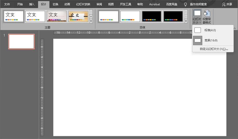 我们能看到默认的幻灯片大小为宽屏(16:9),同时我们能看到另外一种常用的幻灯片大小为标准(4:3)。