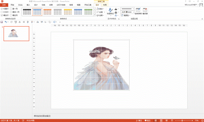 下面进行网状设置。依然是选中整个表格,在绘制边框中设置颜色为浅灰,粗细为1磅,然后在边框样式中先选择无边框,再分别点选斜线,这样效果就好了,看上去比较密,我们可以在一开始插入表格的时候单元格少一点。这个技巧本身是图片美化表格的,反而成为了用表格美化图片的工具。