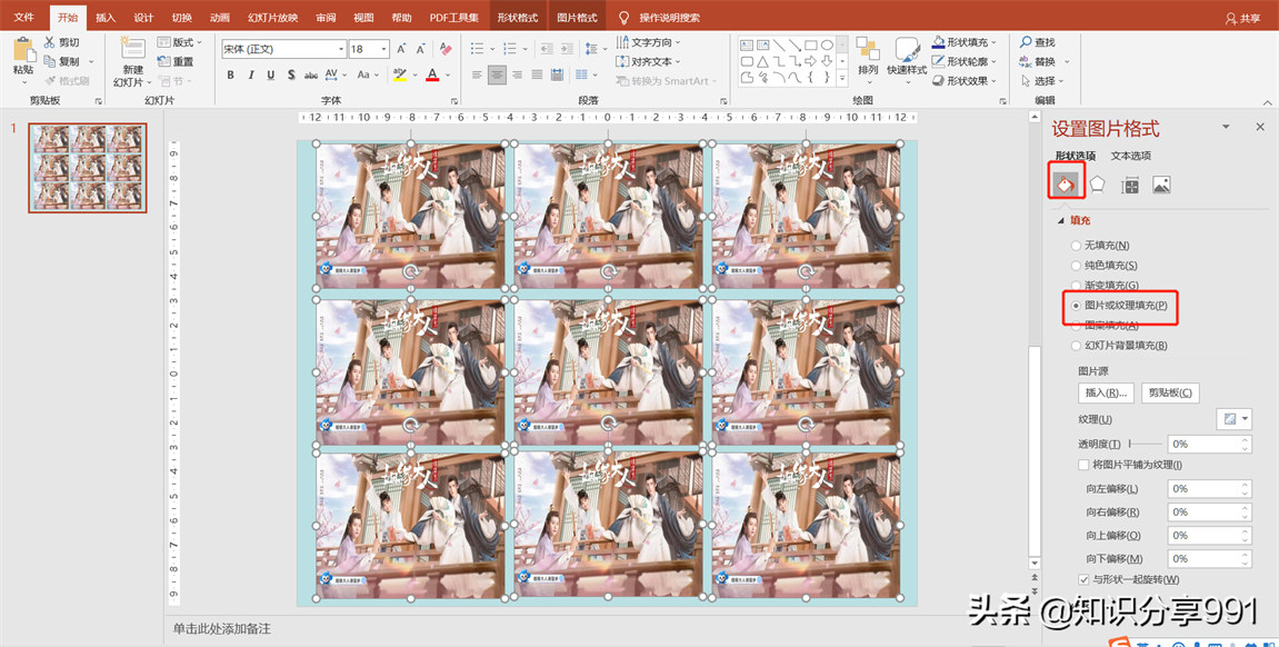 ⑥在设置图片格式设置框中,选择下方的填充,勾选图片或纹理填充。不合并单元格的九宫格制作完成。