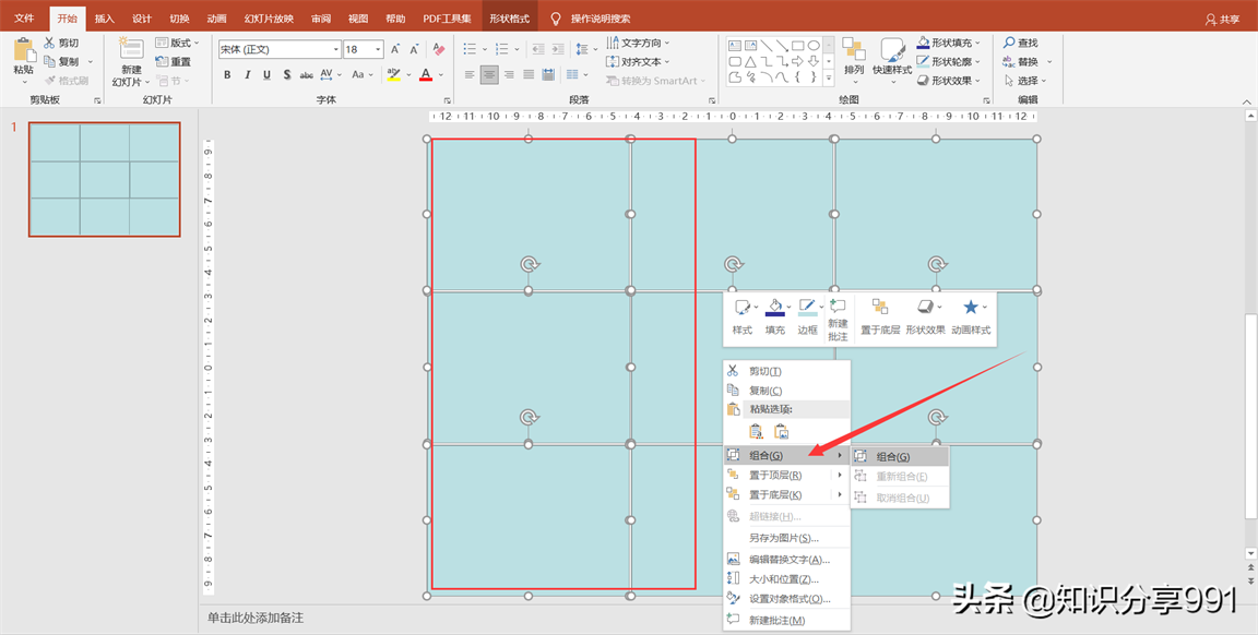 ③选中幻灯片中的所有矩形形状,点击鼠标右键选择组合,可以将所有矩形合并到一个整体,将图片剪切掉。