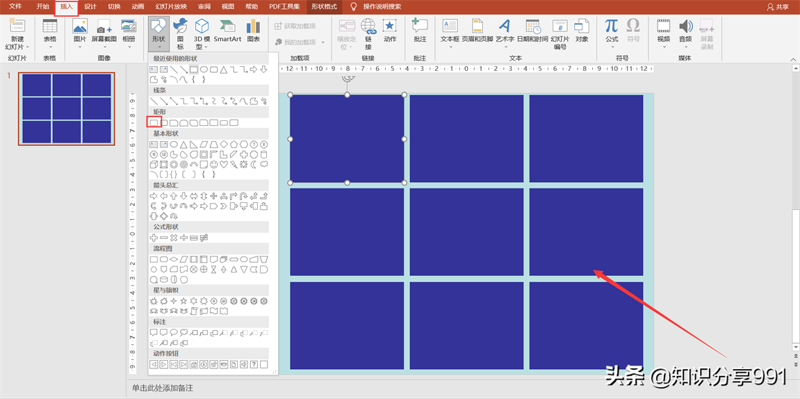 ②点击菜单栏中的插入选项,选择下方的形状,选择矩形,在空白幻灯片中插入九个矩形框。