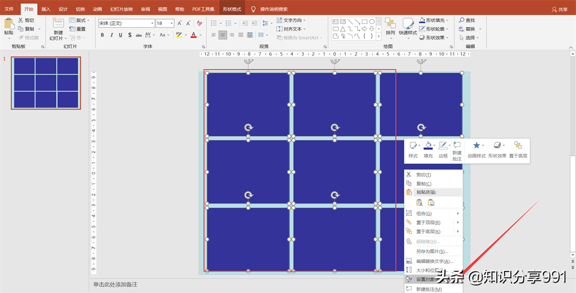 ⑤鼠标选中幻灯片中的所有矩形框,然后点击鼠标右键,在弹出的选项中选择设置对象格式设置。