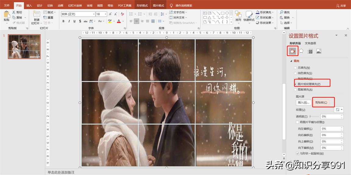 ④在设置图片格式中,选择图片或纹理填充,点击剪切板,幻灯片中的图形就被填充了。