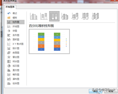 选择图表,执行“设计”菜单-“更改图表类型”按钮,打开“更改图表类型 ”对话框,选择“柱形图”-“百分比堆积柱形图”,“确定”之。