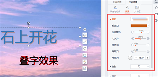 最佳答案示例图:操作方法:①:鼠标点击需要制作叠字效果的文本框,在弹出的【对象属性】菜单栏中选择【文本选项】,然后点击【效果】图标。阴影:【外部】——【右下斜偏移】;②:修改阴影需要设置。其实这里可以根据需要自行设置。示例参数设置如下:颜色:【自行选择】透明度:【60】大小:【100%】模糊:【4磅】距离:......