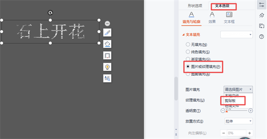 右键单击裁剪后的图片,再切选择【剪切】,然后右键单击需要修改的文本框——【文本选项】——【图片或纹理填充】——【图片填充】中选择【粘贴板】