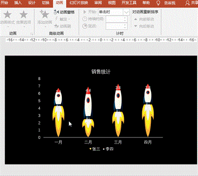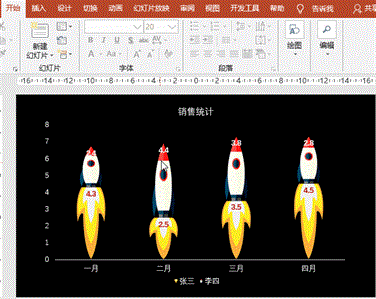 表格图表——插入柱状图——变换为火箭图表样式——添加动态效果。