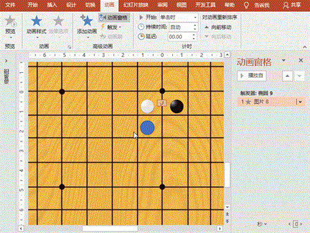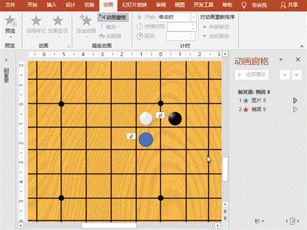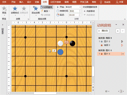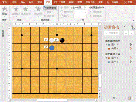 (1)黑子消失:选择黑子,“动画”菜单-“添加动画”-“退出”之“消失”,点击动画菜单之“动画窗格”按钮,点击右侧箭头,计时标签中设置开始为“单击时”、触发器选择“黑子”;