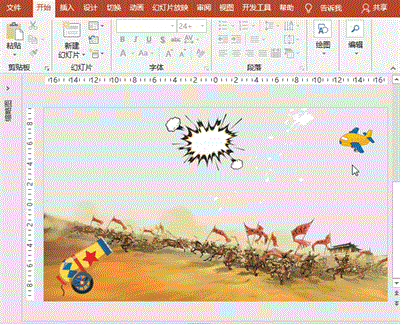 (2)插入图片:执行“插入”菜单-“图像”-“图片”命令,插入准备好的导弹炮、导弹、飞机、爆炸图片,调整大小、方向和位置,使导弹位于底层、爆炸图片位于顶层。