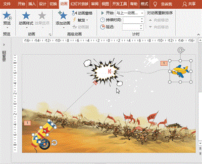 (1)飞机飞行动画:选择飞机,“动画”菜单-“添加动画”-“动作路径”之“自定义路径”,绘制出飞机飞行的轨迹,设置开始为“单击时”、持续时间5秒、延迟为0;