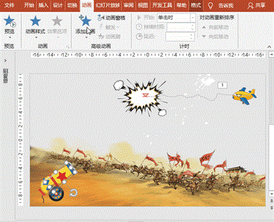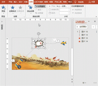 (4)爆炸动画:选择爆炸图片,执行“动画”菜单-“添加动画”-“进入”之“出现”,设置开始为“上一动画之后”、持续时间自动、延迟为0秒;执行“动画”菜单-“添加动画”-“强调”之“放大/缩小”,点击动画菜单之“动画窗格”按钮,点击右侧箭头,效果标签中设置尺寸为200%、声音为“爆炸”,计时标签中设置开始为“上一动画之后”、延迟为“0”、期间“2秒”;执行“动画”菜单-“添加动画”-“退出”之“向外溶解”,设置开始为“上一动画之后”、持续时间0.5秒、延迟为0。