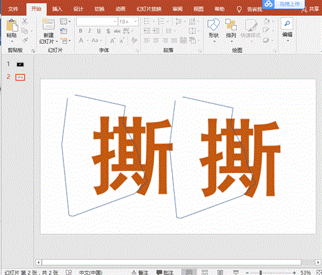 4、略微旋转左片、右片的角度,放置于合适位置。若有多个文字,则使用相同的方法制作其余文字的撕裂效果,整个极具冲击力的撕裂字效果便完成了。