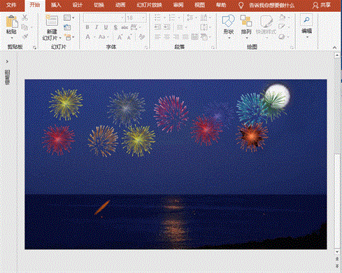 4、设置烟花。“插入”菜单-“图片”命令,选择插入准备好的烟花素材图片,并将其满布于屏幕上方;选择其中的一个图片,拖动至火信的动画终点;动画”菜单“添加动画”-“进入”-“淡入”命令,设置开始为“上一动画之后”,持续时间为0.5,延迟为0;“添加动画”-“强调”-“放大/缩小”命令,设置开始为“上一动画之后”,持续时间为2,延迟为0;点击“动画”菜单-“动画窗格”按钮,设置尺寸为巨大400%;动画”菜单“添加动画”-“更多退出效果”-“向外溶解”命令,设置开始为“上一动画之后”,持续时间为0.5,延迟为0。选择刚设置完成的烟花,双击“动画”菜单之“动画刷”按钮,点刷其他烟花图片。