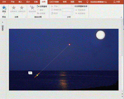 3、设置火信。执行“插入”菜单-“形状”之“椭圆”,绘制椭圆;右键选择“设置形状格式”菜单,形状选项之填充中选择“渐变填充”,类型设为“线性”、光圈设为“黄色渐变”;线条设为无线条,柔化边缘设为4磅;动画”菜单“添加动画”-“进入”-“淡入”命令,设置开始为“上一动画之后”,持续时间为0.5,延迟为0;“动画”菜单“添加动画”-“动作路径”-“直线”,拖动红色箭头,设置火信上升路径,设置持续时间为1,延迟为0;动画”菜单“添加动画”-“退出”-“消失”命令,设置开始为“上一动画之后”,持续时间为0.5,延迟为0;