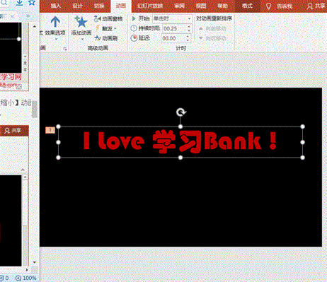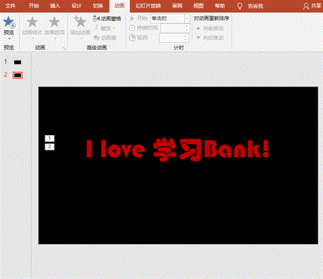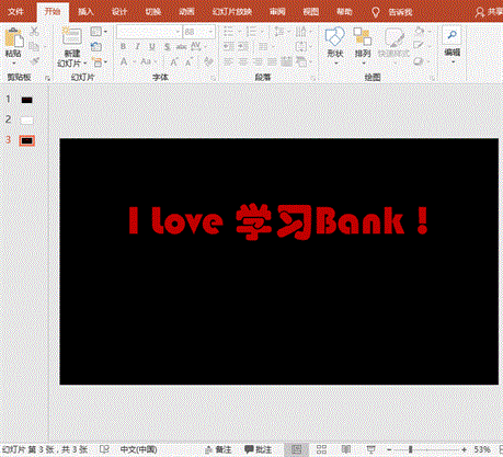 2、插入文本框,输入文字,“I Love 学习Bank!”,设置文字颜色为“红色”,并按自己的喜好调整字体、字号和文本的位置。
