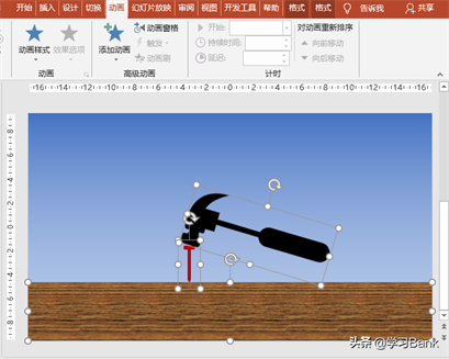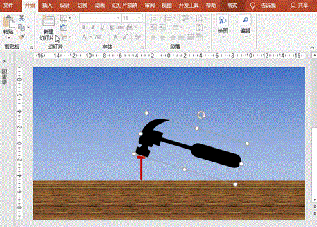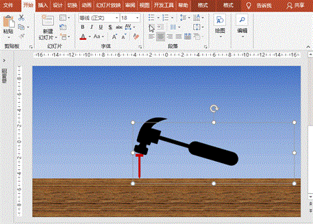 (1)基本元素绘制:使用“插入”菜单-“形状”,插入各种形状元素制作出锤子、钉子、木板,调整大小、角度和位置,如下图(咱们主要学习动画的制作,基本图形的制作这里略过)。