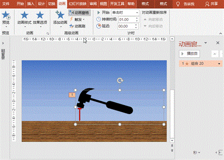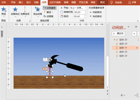 (3)钉子下移:选择钉子,执行“动画”菜单-“添加动画”-“动作路径”之“直线”,拖动起止位置,使终点约进入木板一半左右,效果标签中设置平滑开始为0、平滑结束为0、声音为“锤打”,计时标签中设置开始为“与上一动画同时”、延迟为“0.4秒”、持续时间“0.2秒”、重复为“无”;