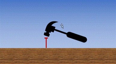 锤子上扬准备——锤子向下锤击钉帽,伴随着敲击声,锤子和钉子一起向钻向木板——再次上扬锤子——同上,钉子完全进入木板。