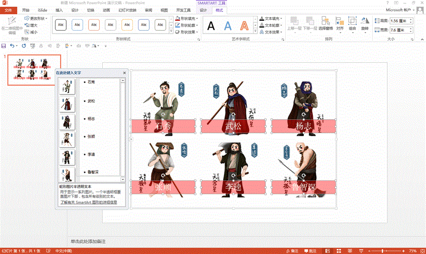 首先选中所有的图片,然后在图片工具中的版式里面选择想要的样式,所有的图形按照既定的SmartArt版式瞬间完成了排版,我们可以了解到SmartArt其实是一个多功能的整合,涵盖排版、配色、尺寸调整、对齐、组合等功能于一体。我们可以在左侧的编辑栏中输入图片对应的名称,然后选中所有的文本框进行颜色调整,都是分分钟搞定的事,是不是很简单呢?