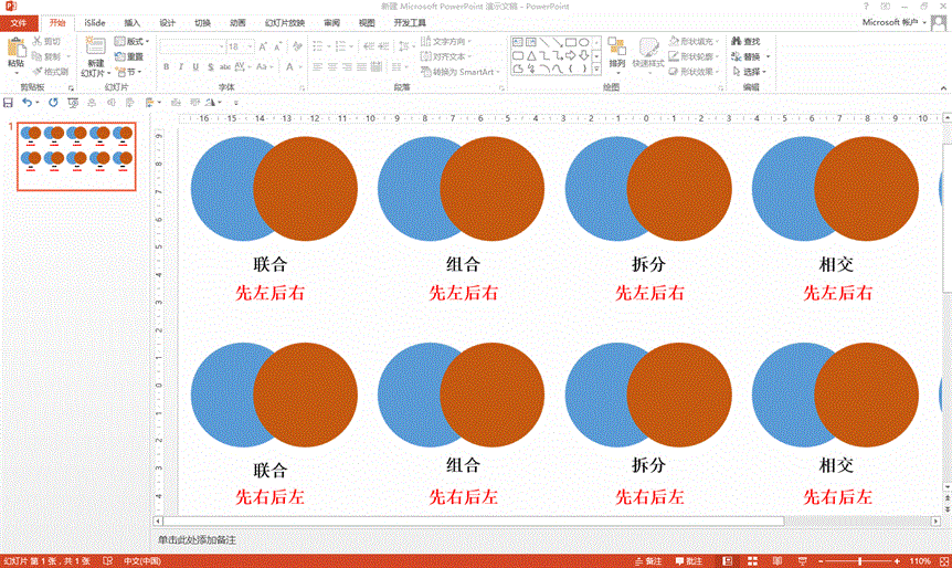 要知道,合并形状的功能在图片工具下,为了方便使用,我们先将其添加到快速访问工具栏。图中两个部分重叠的圆形分别填充了不同的颜色,左边蓝色,右边红色,先选中蓝色然后按住Ctrl键再选中红色,然后点击“联合”,就将两个形状合并成一个,而且颜色为蓝色,然后就可以对其进行其他的操作。如果先选择红色再选择蓝色进行联合,结果就是一个红色的形状,大家明白了吧?组合是去除多个形状重叠的部分,然后组成一个整体,这样中间的椭圆就去掉了。