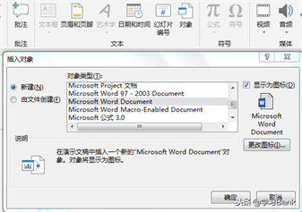 2、打开“插入对象”对话框,选择“Microsoft Word文档”选项并单击“确定”按钮。
