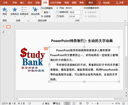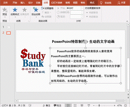 如果文本框中的文字由多个段落组成,我们还可以设置它的动画效果以段落的方式出现。