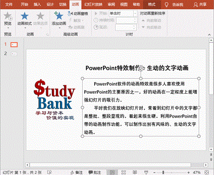 平时我们在放映幻灯片时,常看到幻灯片中的文字都是整批、整段显现的,看起来很生硬。利用PowerPoint自带的动画制作功能,可以制作出别有风味的、生动的文字动画。