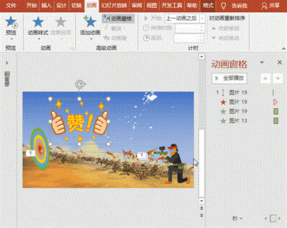 (4)点赞动画:选择点赞图片,执行“动画”菜单-“添加动画”-“进入”之“缩放”,点击“动画”菜单之“动画窗格”按钮,点击右侧箭头,效果标签中设置消失点为“对象中心”、声音为“鼓掌”,计时标签中设置开始为“与上一动画同时”、持续时间2秒、延迟0;执行“动画”菜单-“添加动画”-“强调”之“跷跷板”,设置开始为“与上一动画同时”、持续时间5秒、延迟0。