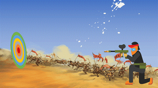 开枪射击,子弹飞出——击中靶心,子弹消失,留下弹孔——点赞。